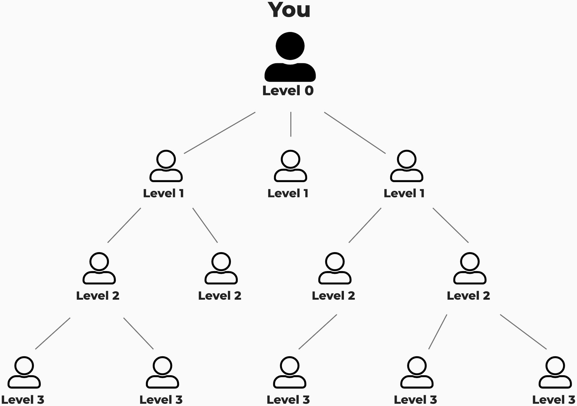 Levels: The multi-level structure consists of different levels or tiers of affiliates, with affiliates at the top being at higher levels and those they recruit forming lower levels. Our affiliate network has 3 levels: